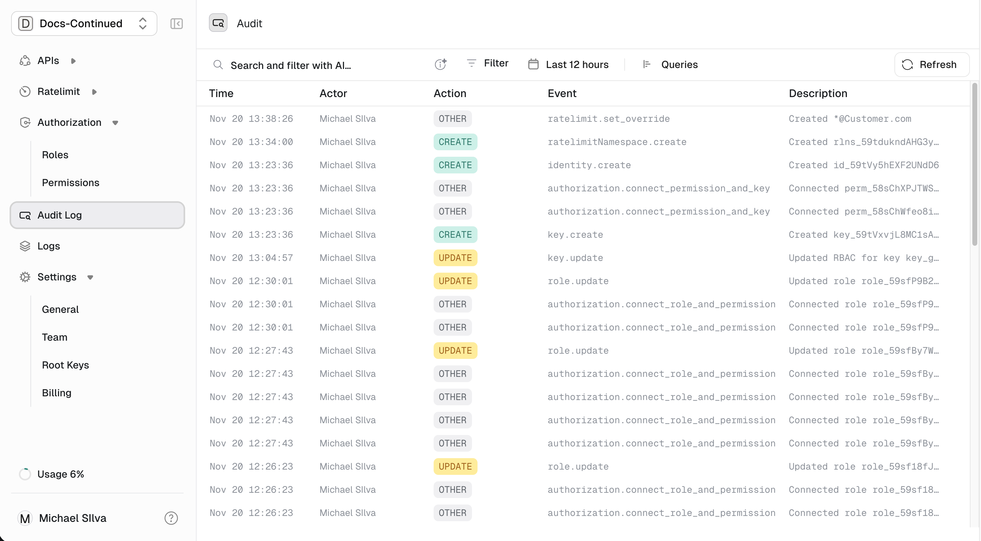Audit logs capture every mutation in your workspace — key creation, permission changes, revocations, and more. They’re essential for security compliance, debugging, and understanding who changed what and when.